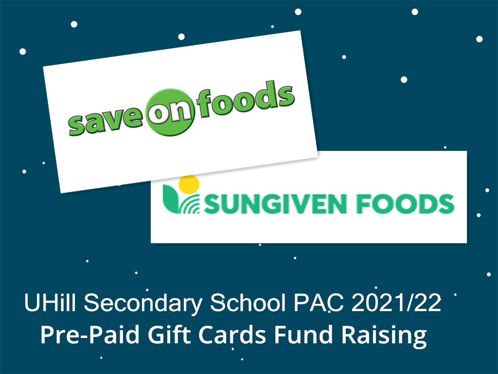 UHill Secondary PAC is offering the Save-On-Foods and SUNGIVEN FOODS Pre-Pay Grocery Card Fundraiser again this year. We’ve had great success in the past and this year promises to be even greater! All money raised goes to UHill and will provide essential additional funding to support quality educational programs and materials our kids may otherwise not receive.